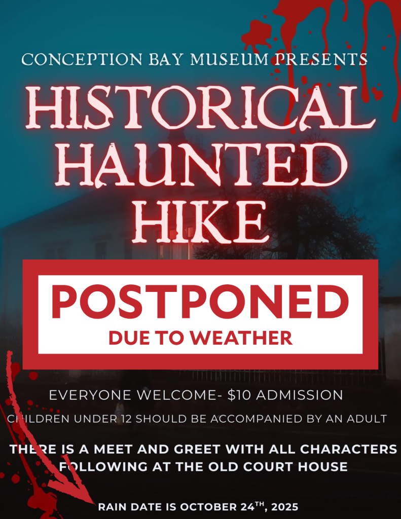 The Conception Bay Museum, Harbour Grace will be postponing the Haunted Hike event till next Friday, October 24, due to inclement weather. We look forward to seeing you next Friday for another fun edition of this annual event.