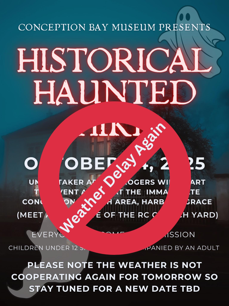 The Conception Bay Museum has been forced to postpone their annual Historical Haunted Hike due to weather conditions anticipated for tomorrow. Please stay tuned for a new date TBA.