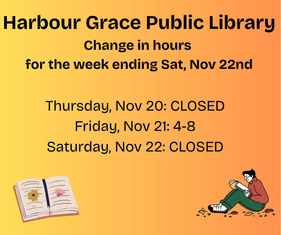There’ll be a change in library hours this week (week ending Nov. 22):