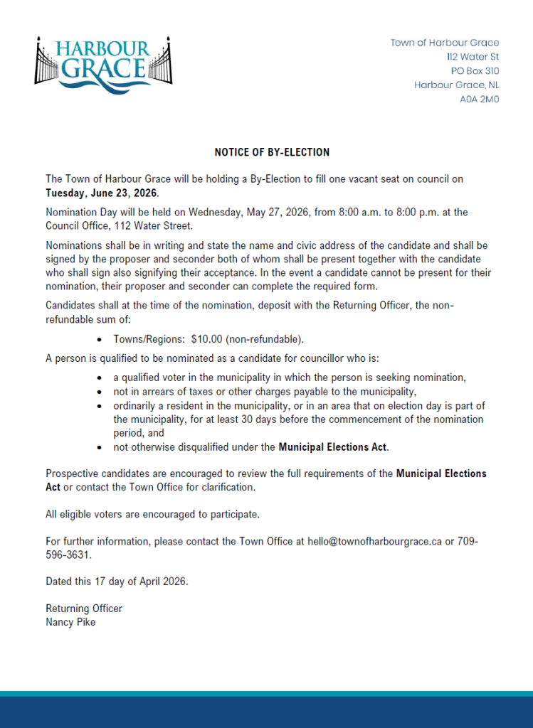 The Town of Harbour Grace will be holding a By-Election to fill one vacant seat on council on Tuesday, June 23, 2026.