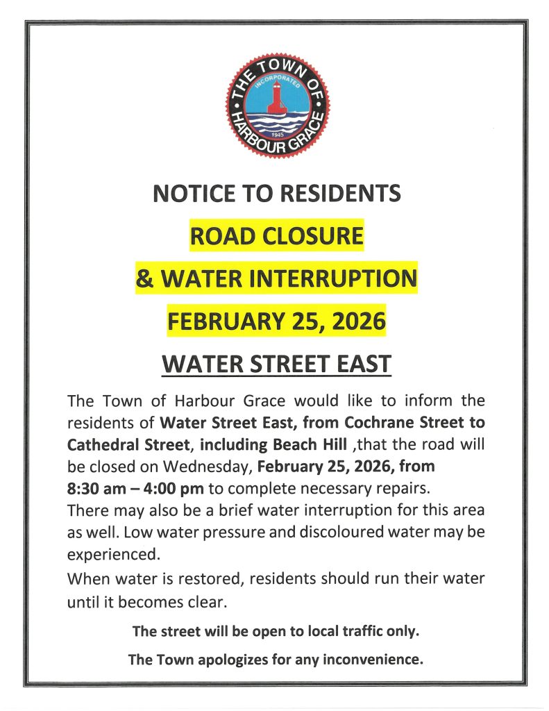 NOTICE TO RESIDENTS – Road Closure and Water Interruption, February 25, 2026, for Water Street East Tuesday, February 24, 2026 Home NOTICE TO RESIDENTS - Road Closure and Water Interruption, February 25, 2026, for Water Street East