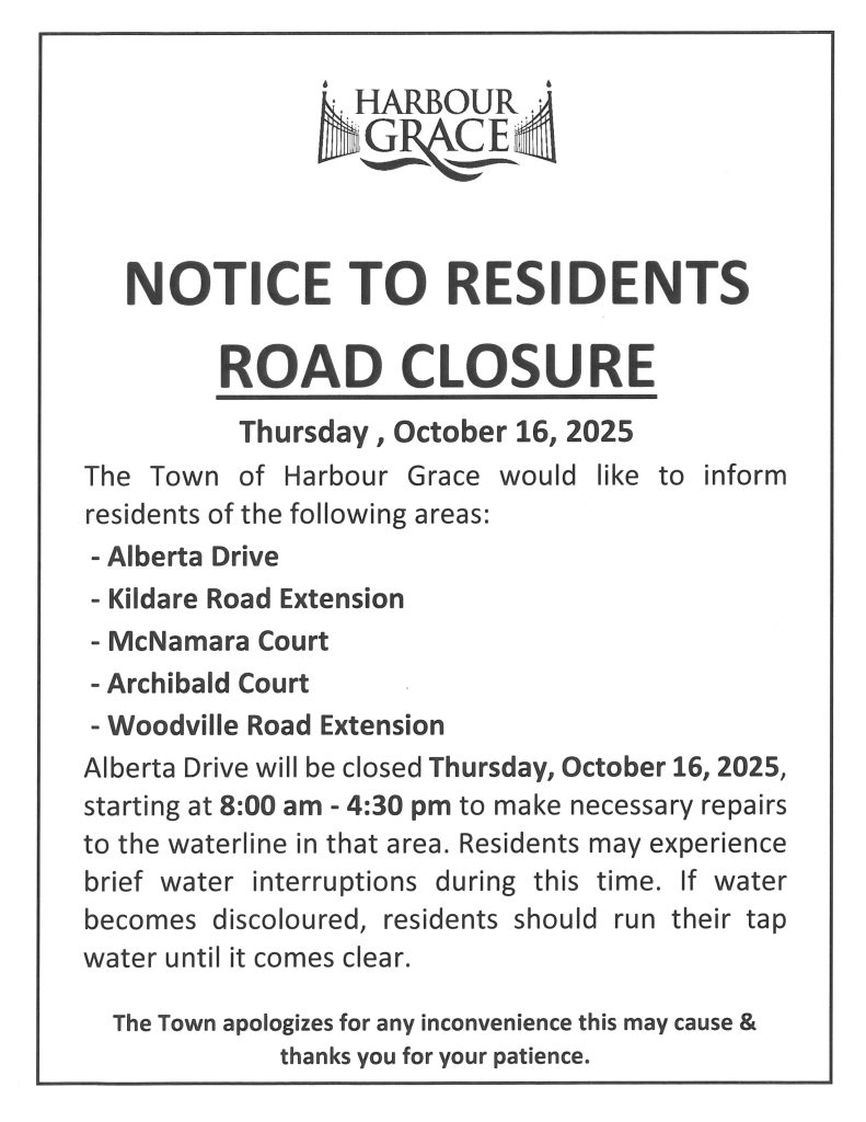 ROAD CLOSURE – ALBERTA DRIVE, THURSDAY, OCTOBER 16, 2025, 8:00 AM – 4:30 PM Wednesday, October 15, 2025 Home ROAD CLOSURE - ALBERTA DRIVE, THURSDAY, OCTOBER 16, 2025, 8:00 AM - 4:30 PM
