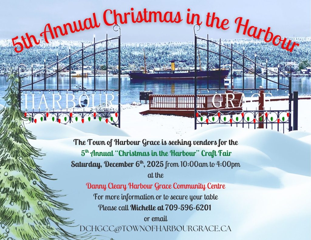 The Town of Harbour Grace is seeking vendors for the 5th Annual “Christmas in the Harbour” Craft Fair, happening Saturday, December 6, 2025, from 10 a.m. – 4 p.m. at the Danny Cleary Harbour Grace Community Centre.