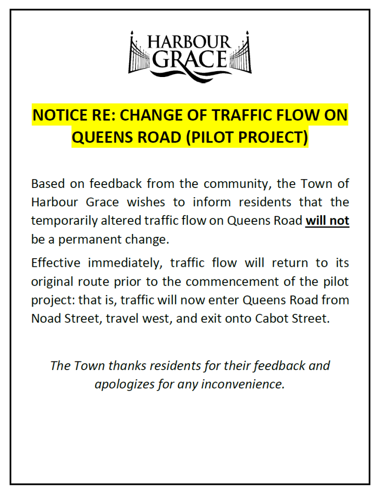 Based on feedback from the community, the Town of Harbour Grace wishes to inform residents that the temporarily altered traffic flow on Queens Road will not be a permanent change.