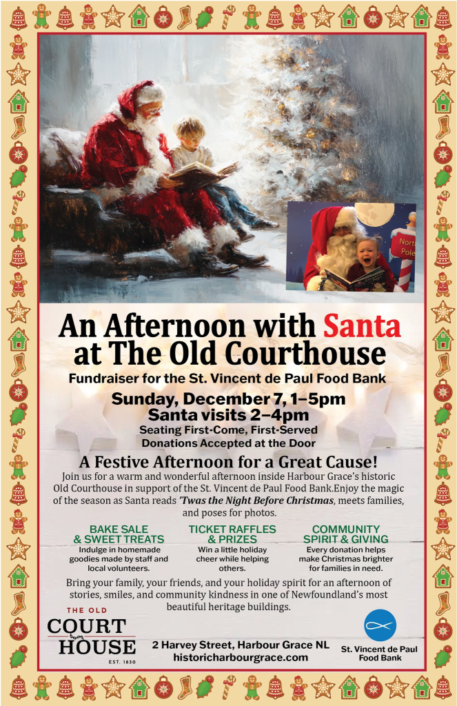 Join the Old Courthouse for a festive afternoon in support of the St. Vincent de Paul Food Bank. Enjoy the magic of thee season as Santa reads ‘Twas the Night Before Christmas, meets families, and posoes for photos. There’ll also be a bake sale, ticket raffle, prize draw.