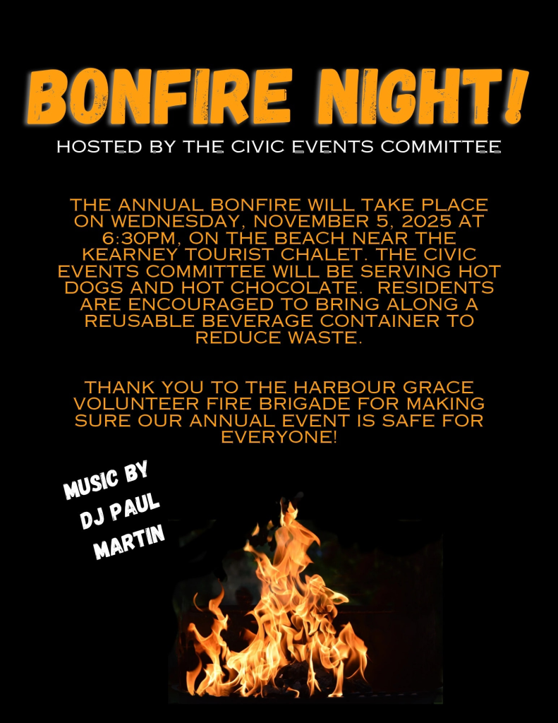 The Annual Bonfire will take place on Wednesday, November 5, 2025, at 6:30 p.m. on the beach near the Kearney Tourist Chalet.