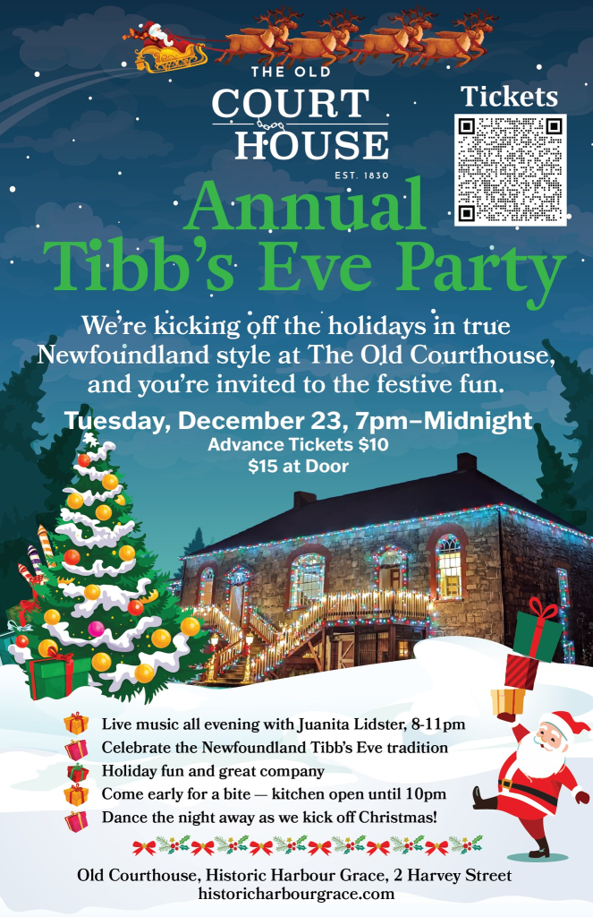 The Old Courthouse, Harbour Grace, will host their Annual Tibb’s Eve Party on Tuesday, December 23, starting at 7 p.m. Music by Juanita Lidster from 8 – 11 p.m. Kitchen open until 10 p.m. Dance the night away as we kick off Christmas! $10 advance tickets, $15 at the door.