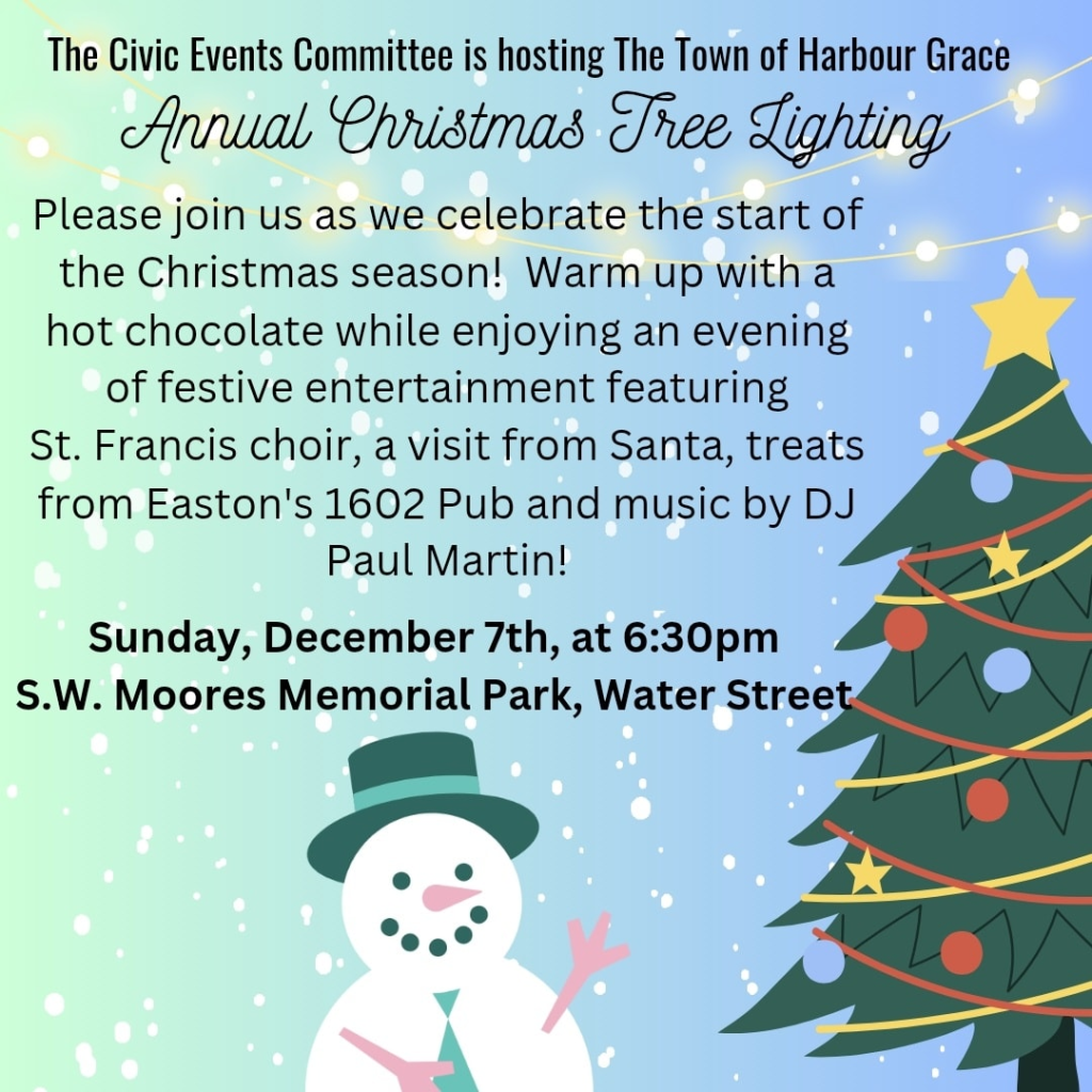 The annual Christmas Tree Lighting with Harbour Grace Civic Events will take place on Sunday, December 7, starting at 6:30 p.m. at the S.W. Moores Memorial Park (across from the Town Hall). Warm up with a hot chocolate while enjoying an evening of festive entertainment, featuring St. Francis Choir, a visit from Santa, treats from Easton 1602 Pub, and music from DJ Paul Martin.