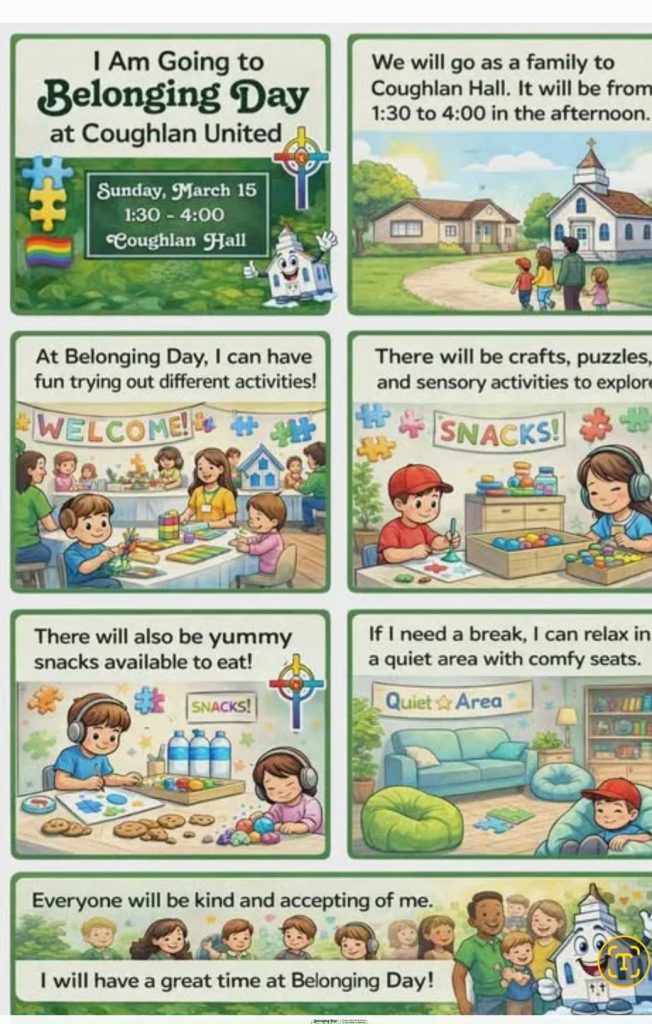 Coughlan United Church will host “Belonging Day” on Sunday, March 15, 2026, from 1:30 – 4 p.m. at Coughlan Hall. Drop by for a fun family day building belonging for all, including those with sensory sensitivities, neurodiverse needs, and differing abilities – and all who benefit from a welcoming and inclusive community!