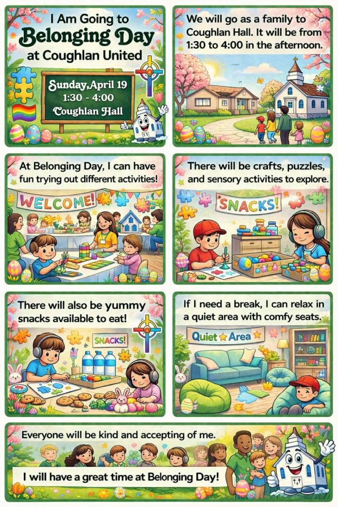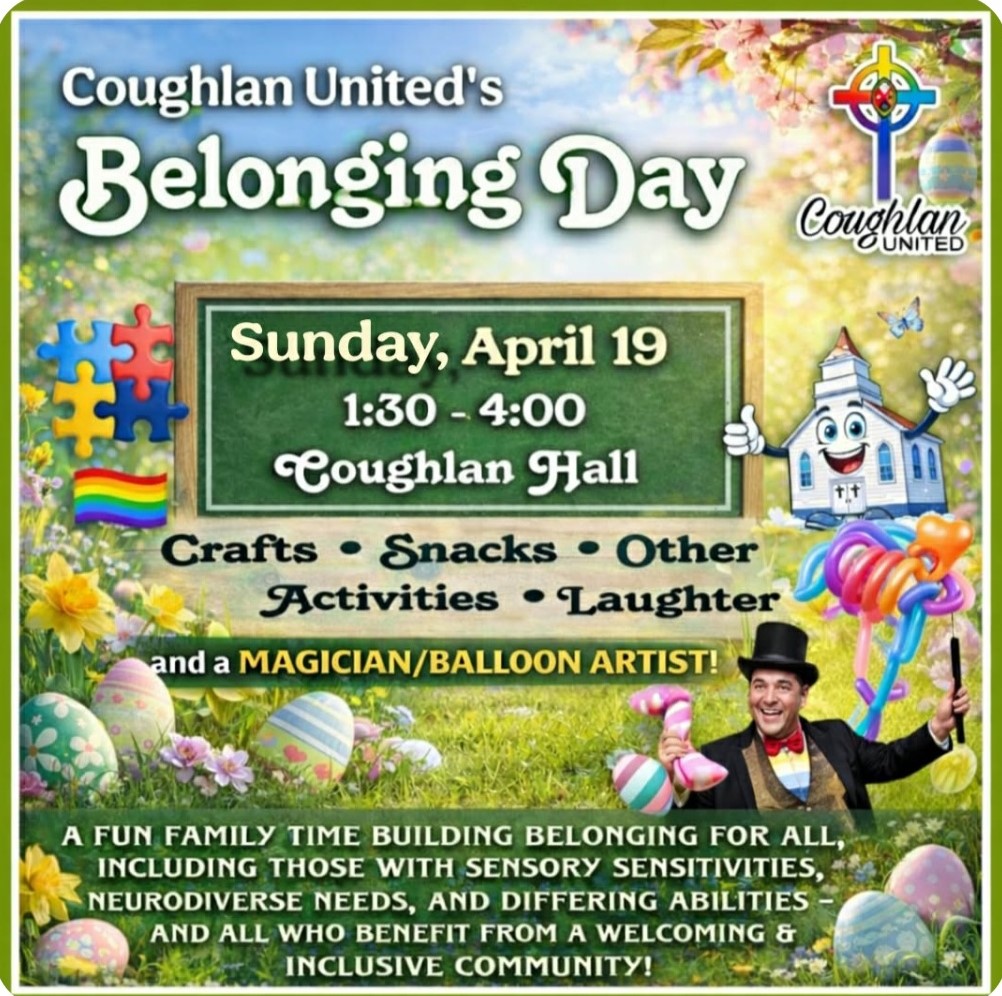 Coughlan United Church will host “Belonging Day” on Sunday, April 19, 2026, from 1:30 – 4 p.m. at Coughlan Hall. Drop by for a fun family day building belonging for all, including those with sensory sensitivities, neurodiverse needs, and differing abilities – and all who benefit from a welcoming and inclusive community!