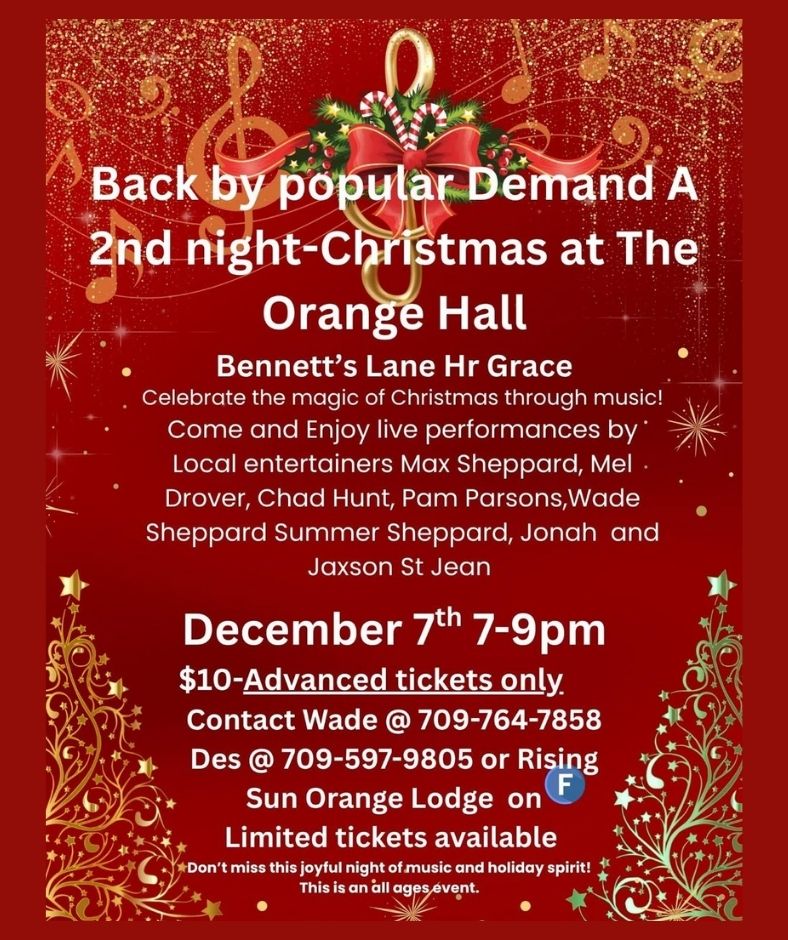 Christmas at the Orange Hall will take place on Sunday, December 7, from 7 – 9 p.m. Performances by Max Sheppard, Mel Drover, Chad Hunt, Pam Parsons, Wade and Summer Sheppard, and Jonah and Jaxon St. Jean. Advance tickets only: $10 each. For tickets, contact Wade at (709) 764-7858, Des at (709) 597-9805, or Rising Sun Orange Lodge on Facebook.