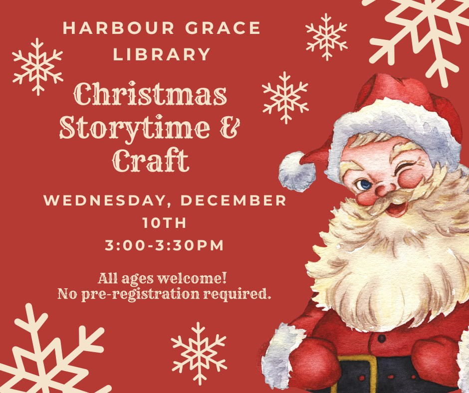 The Harbour Grace War Memorial Public Library will host a Christmas Storytime and Craft event on Wednesday, December 10, from 3 – 3:30 p.m.