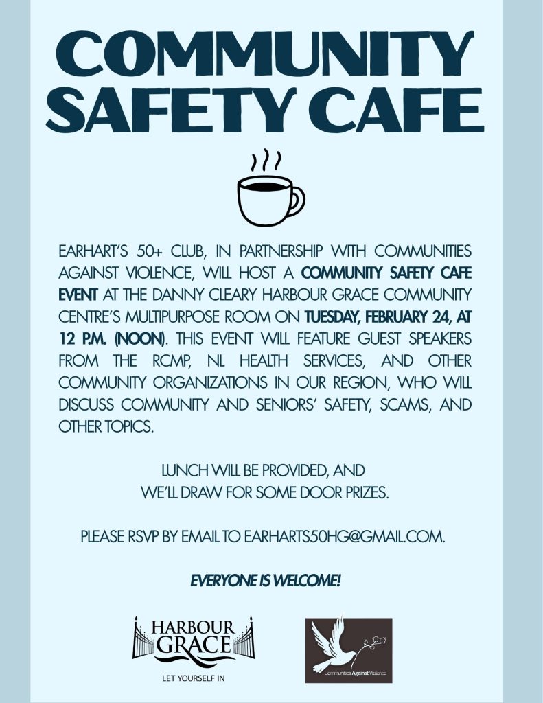 Earhart’s 50+ Club, in partnership with Communities Against Violence (CAV), will host a Community Safety Cafe event at the Danny Cleary Harbour Grace Community Centre’s Multipurpose Room on Tuesday, February 24, from 12 p.m. (noon) – 2 p.m. This event will feature guest speakers from the RCMP, NL Health Services, and other community organizations in our region, who will discuss community and seniors’ safety, scams, and other topics.