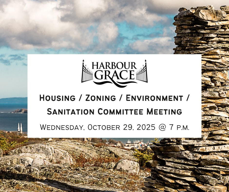 The Town of Harbour Grace’s Housing / Zoning / Environment / Sanitation Committee will have a meeting on Wednesday, October 29, 2025, at 7 p.m. This public may attend this meeting in-person at the Town Hall, 112 Water Street, Harbour Grace.