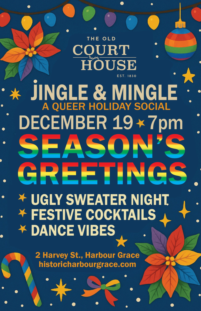 The Old Courthouse will host a Queer Holiday Social on Friday, December 19, starting at 7 p.m. Wear your ugly Christmas sweater and celebrate the season in one of Newfoundland’s most historic spaces—proudly inclusive, beautifully decorated, and ready for a magical night out.