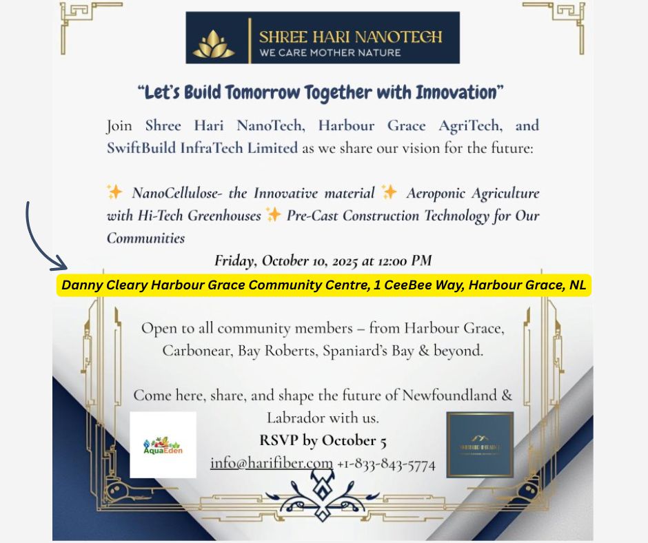 The theme of the event is “Let’s Build Tomorrow Together with Innovation.” Their goal is to share with the community how innovation in nanocellulose manufacturing, greenhouse agriculture, and pre-cast building technologies can create opportunities for growth, sustainability, and local job creation in Harbour Grace and surrounding areas.