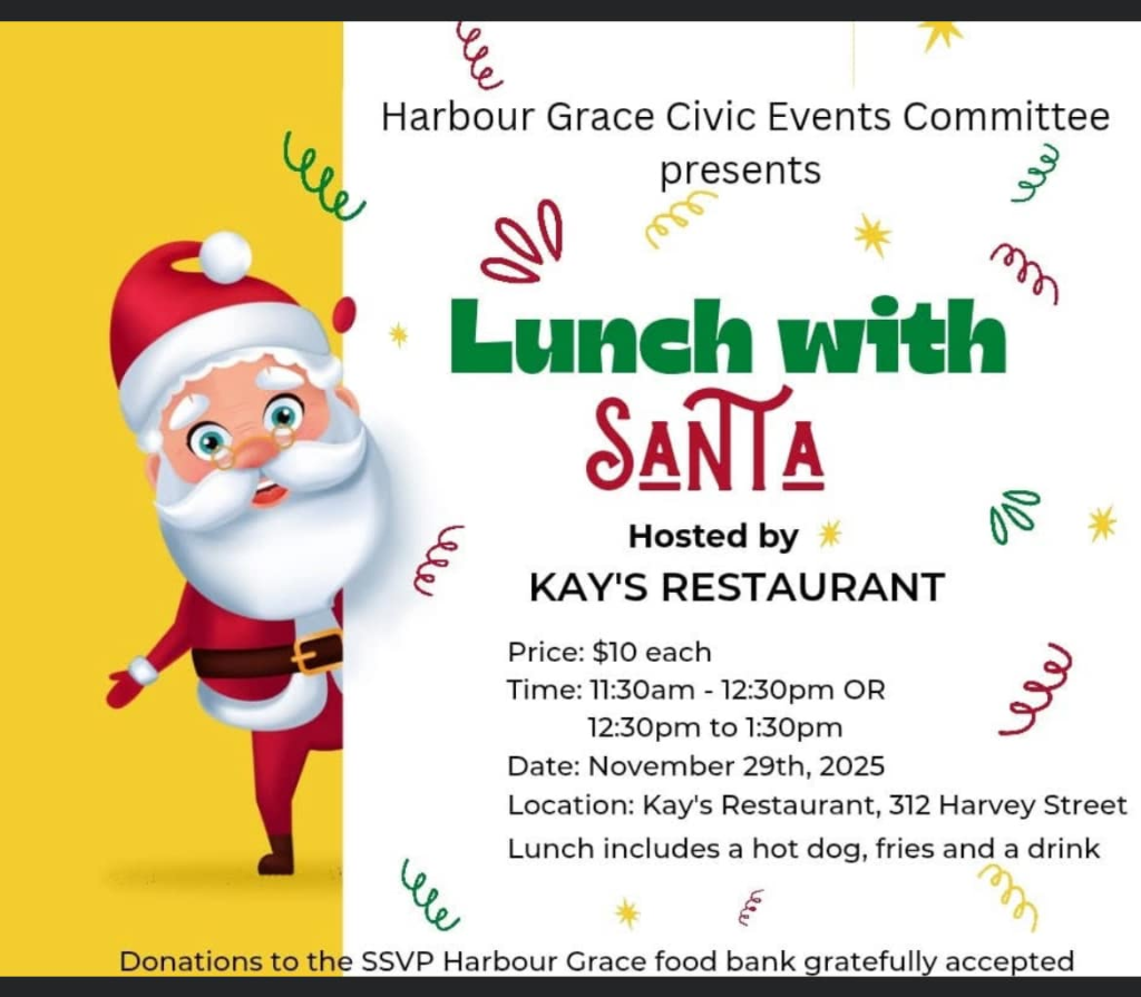With the help of Kay’s Restaurant, Santa will be joining the Harbour Grace Civic Events Committee for a special lunch!