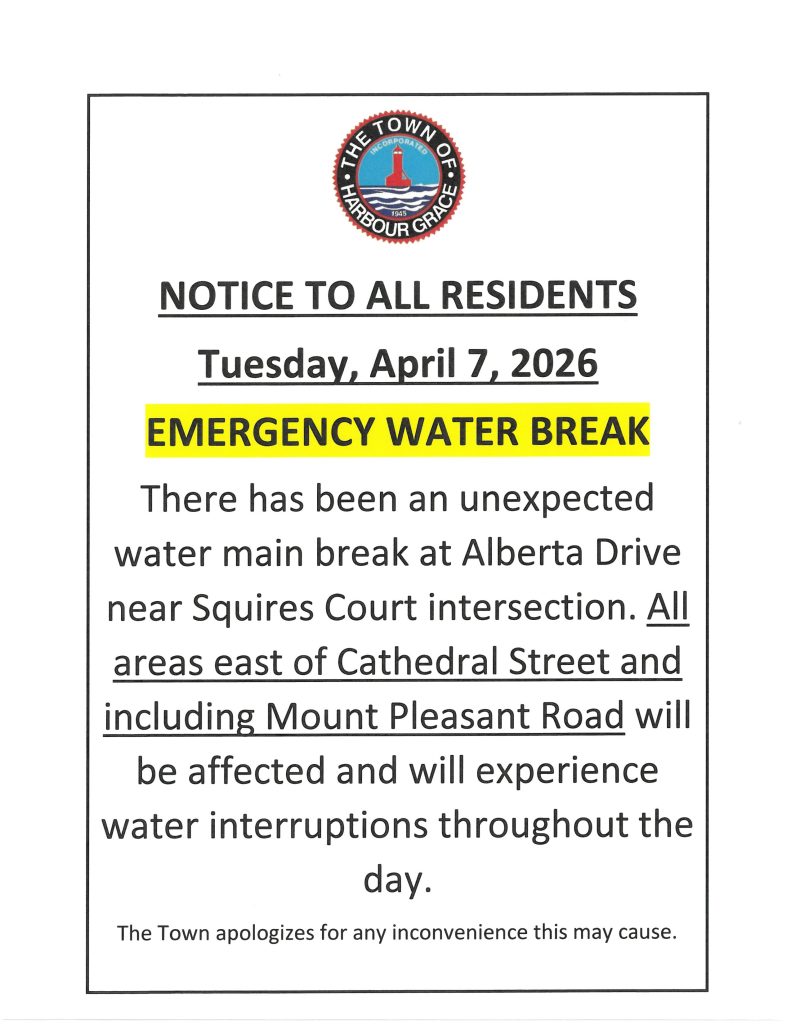 NOTICE TO ALL RESIDENTS Tuesday, April 7, 2026 EMERGENCY WATER LINE BREAK ON ALBERTA DRIVE/SQUIRES COURT 56 years Thursday, January 1, 1970 12:00am Home NOTICE TO ALL RESIDENTS Tuesday, April 7, 2026 EMERGENCY WATER LINE BREAK ON ALBERTA DRIVE/SQUIRES COURT