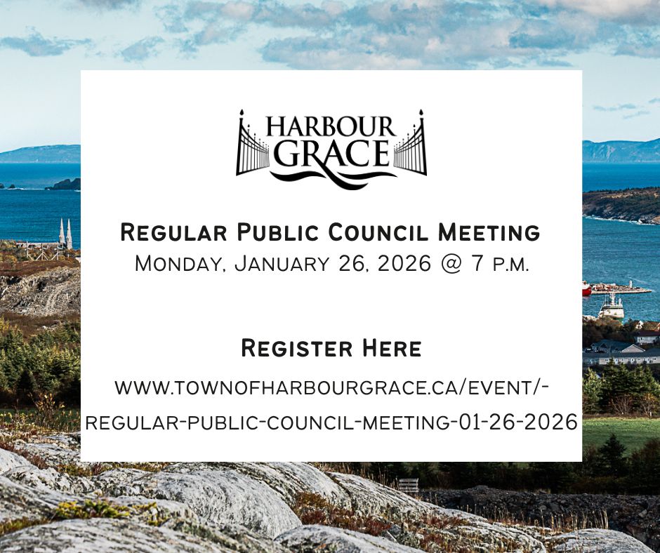 The Town of Harbour Grace will hold a regular public Council meeting on Monday, January 26, 2026, at 7 p.m.