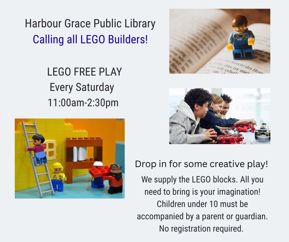 Calling all LEGO builders! LEGO Free Play will be happening at the Harbour Grace War Memorial Public Library every Saturday in 2026, from 11 a.m. – 2:30 p.m.
